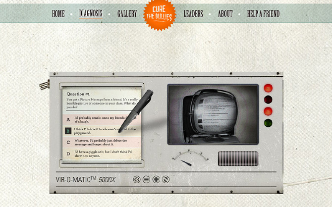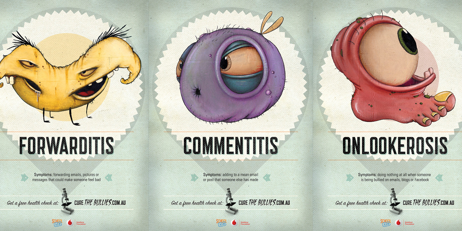 Cure the Bullies was a campaign launched for the combined partnership of the Vodafone Foundation and School Aid. Its purpose was to raise awareness of cyber bulling by transforming the topic into a cartoon-like setting and narrative, staged within an online environment. This allowed kids to learn, play, and interact with the campaign through a dedicated website.