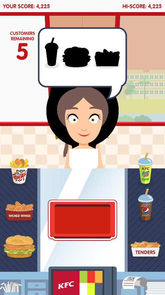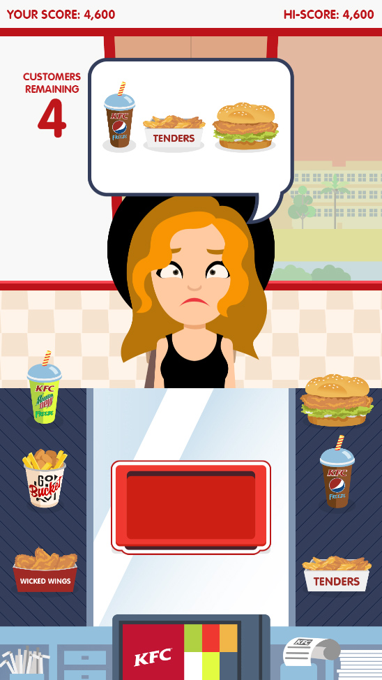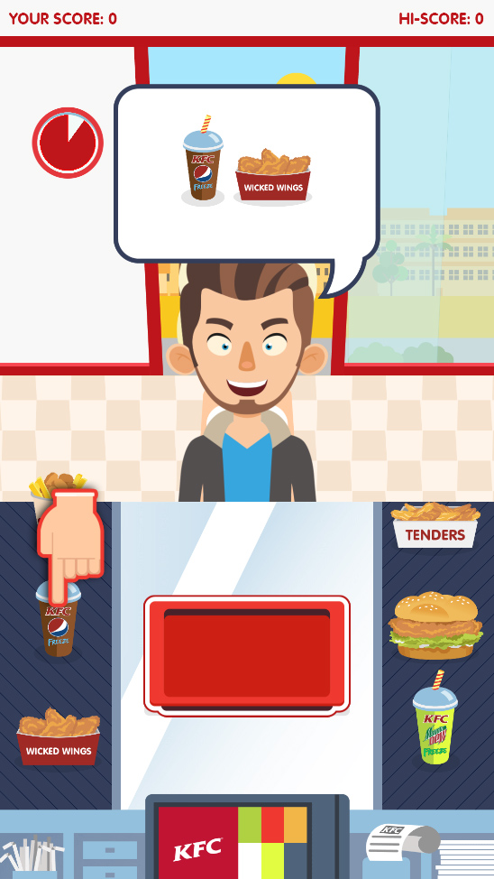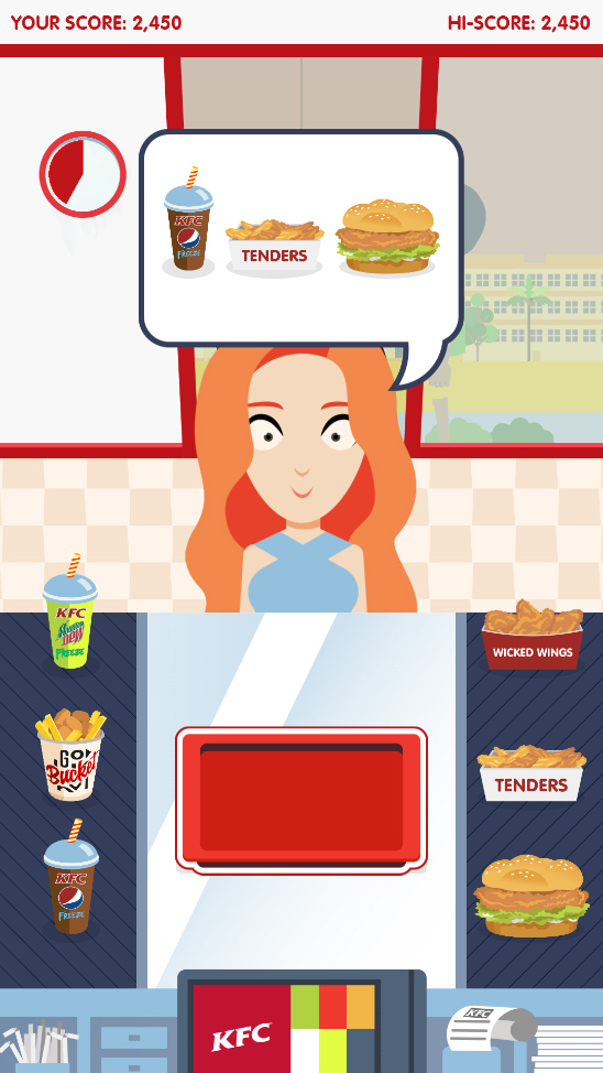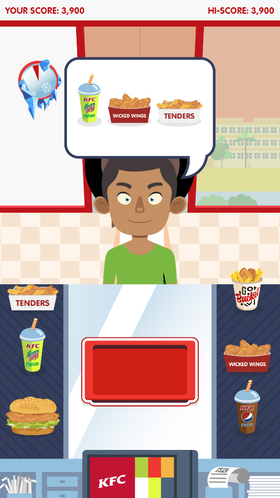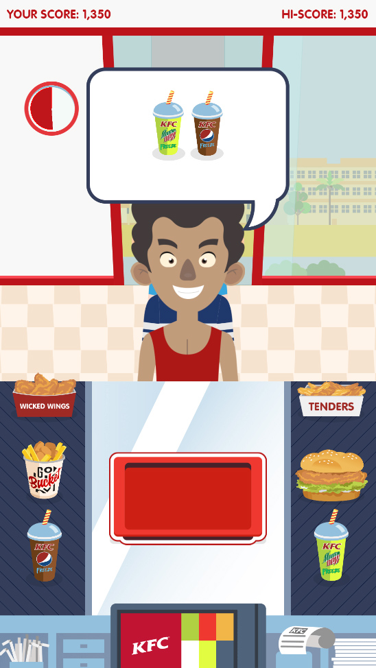 The game was the first title in Australia for Snapchat, built mobile-first from the ground up. The main objective was to serve KFC customers entering the restaurant as quickly as possible. Each customer had a random order, but always included at least one frozen drinks. A fixed time limit ensured the gameplay was impactful and quick, the difficulty progressively increasing as time passed.