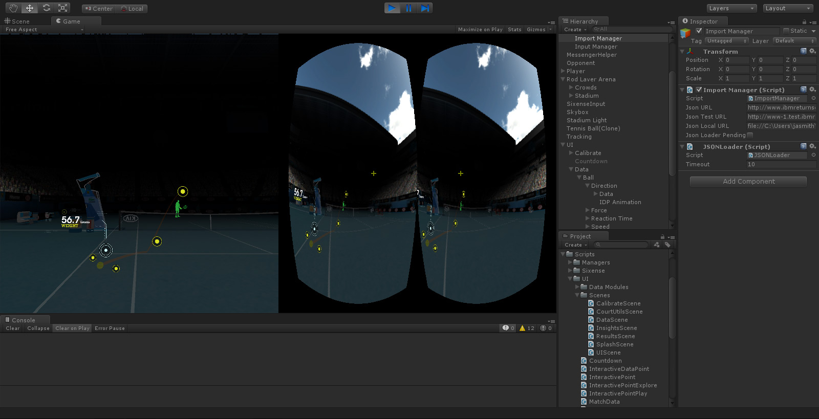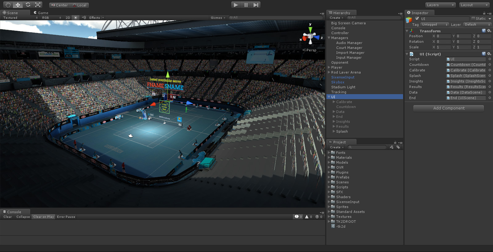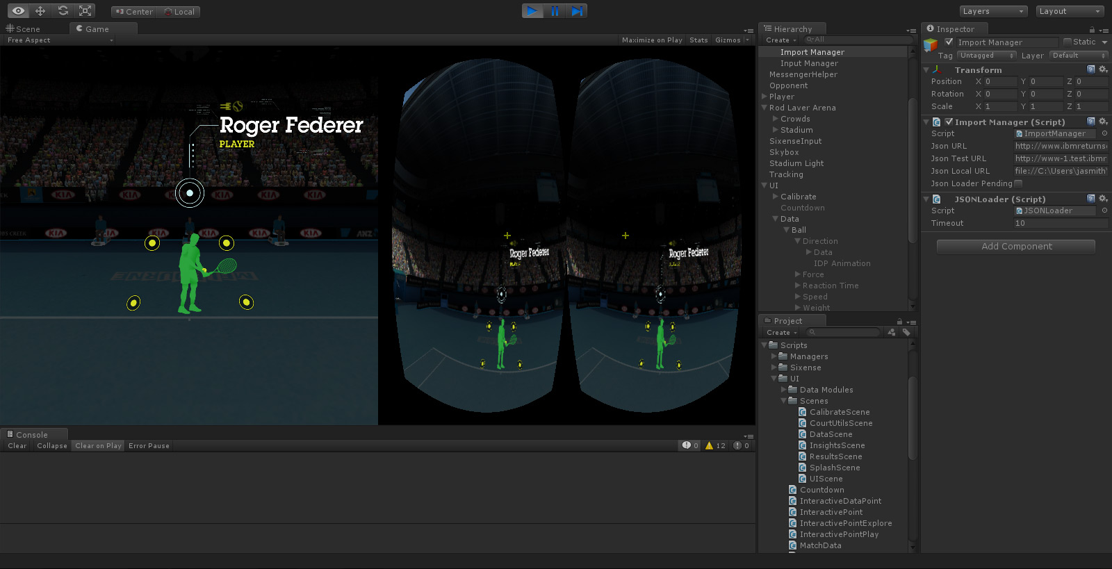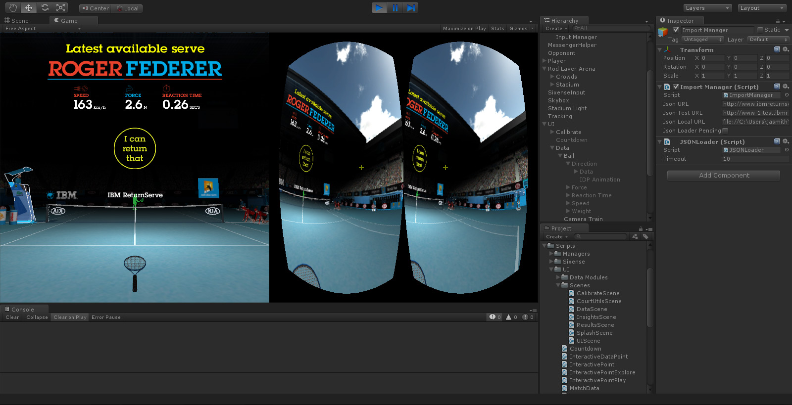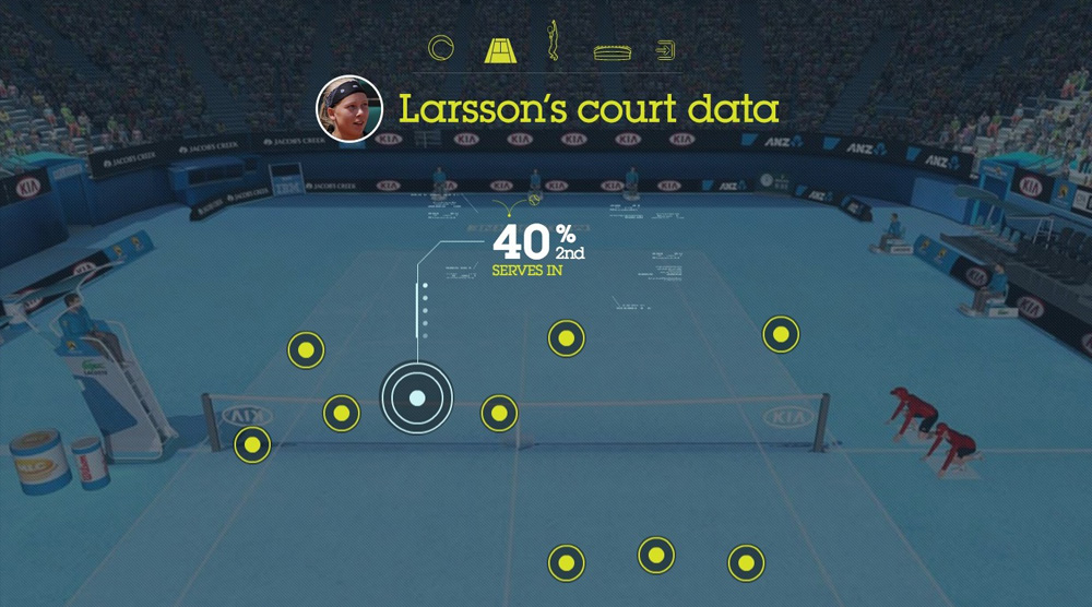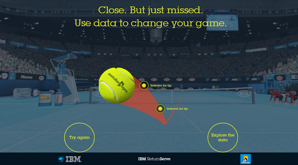 IBM's Return Serve was a virtual reality kiosk application for the 2014 Australian Open Tennis Championships. Powered by IBM's data, processed live from Tennis Australia, participants were challenged to return the last serve played on Rod Laver Arena. Live. To do so, they were required to wear the Oculus Rift headset to immerse themselves in a digital replica of Rod Laver Arena, then take ahold of a Razer Hydra motion sensor controller to swing their virtual tennis racket.