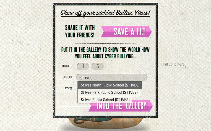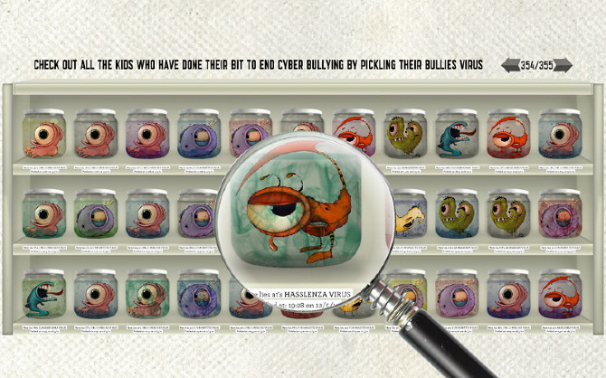 The user journey started with a simple quiz to determine whether you were infected with a bully virus. Once diagnosed, users leveraged the "Virus Extractor" to draw their bully virus into a jar where it had to be "pickled" to cure themselves of their affliction. Pickled bullies were placed on a shelf in the gallery with the user's initials, forever symbolising the bully virus they overcame.