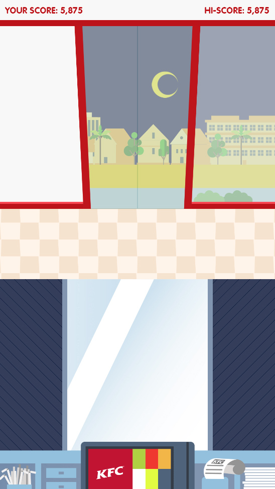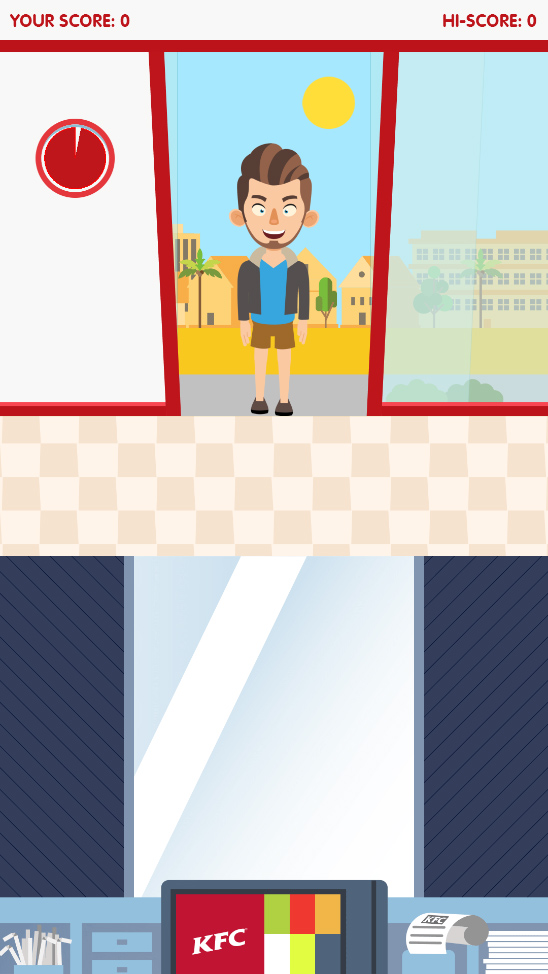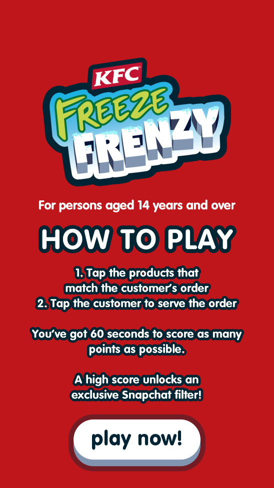 The game was the first title in Australia for Snapchat, built mobile-first from the ground up. The main objective was to serve KFC customers entering the restaurant as quickly as possible. Each customer had a random order, but always included at least one frozen drinks. A fixed time limit ensured the gameplay was impactful and quick, the difficulty progressively increasing as time passed.
