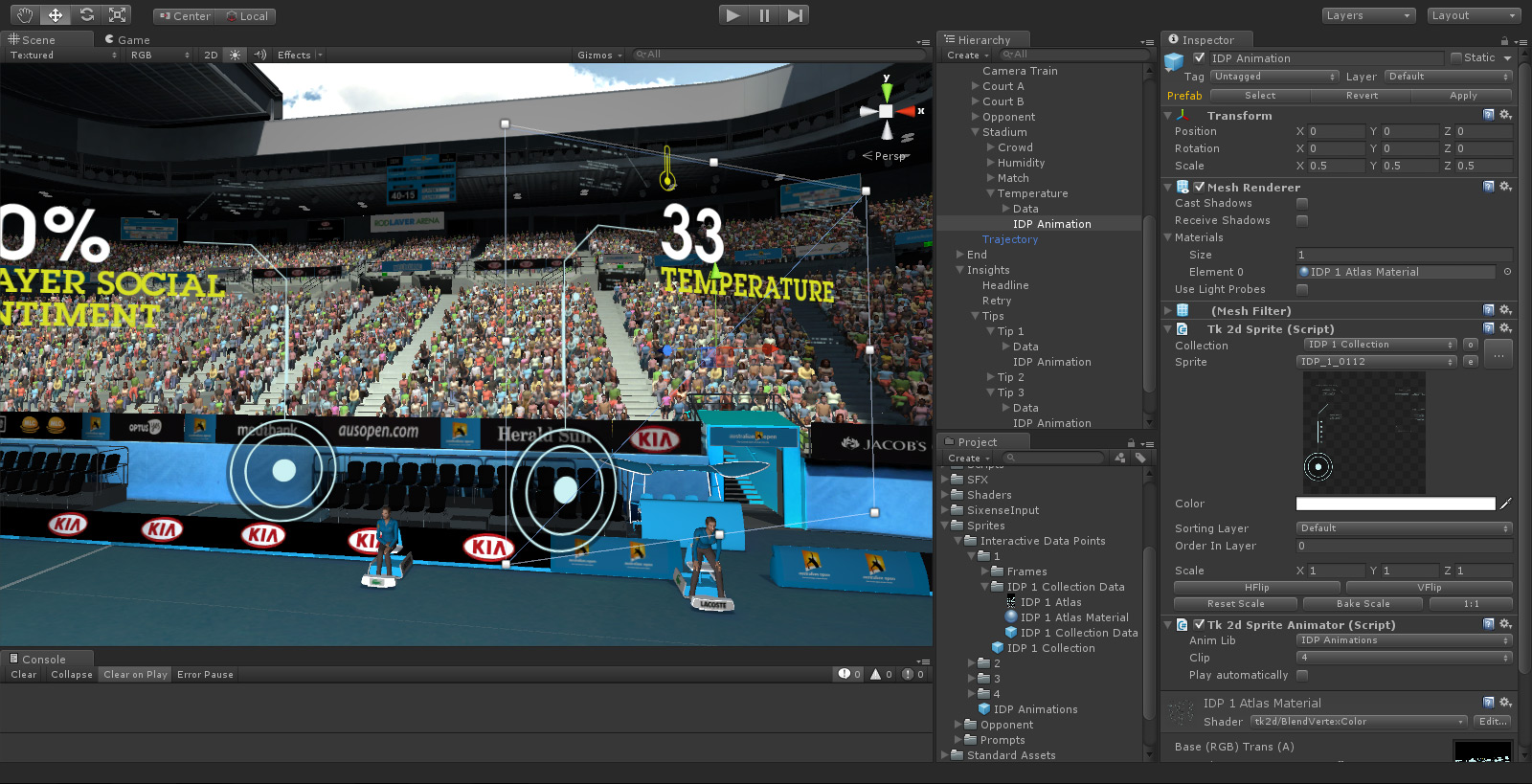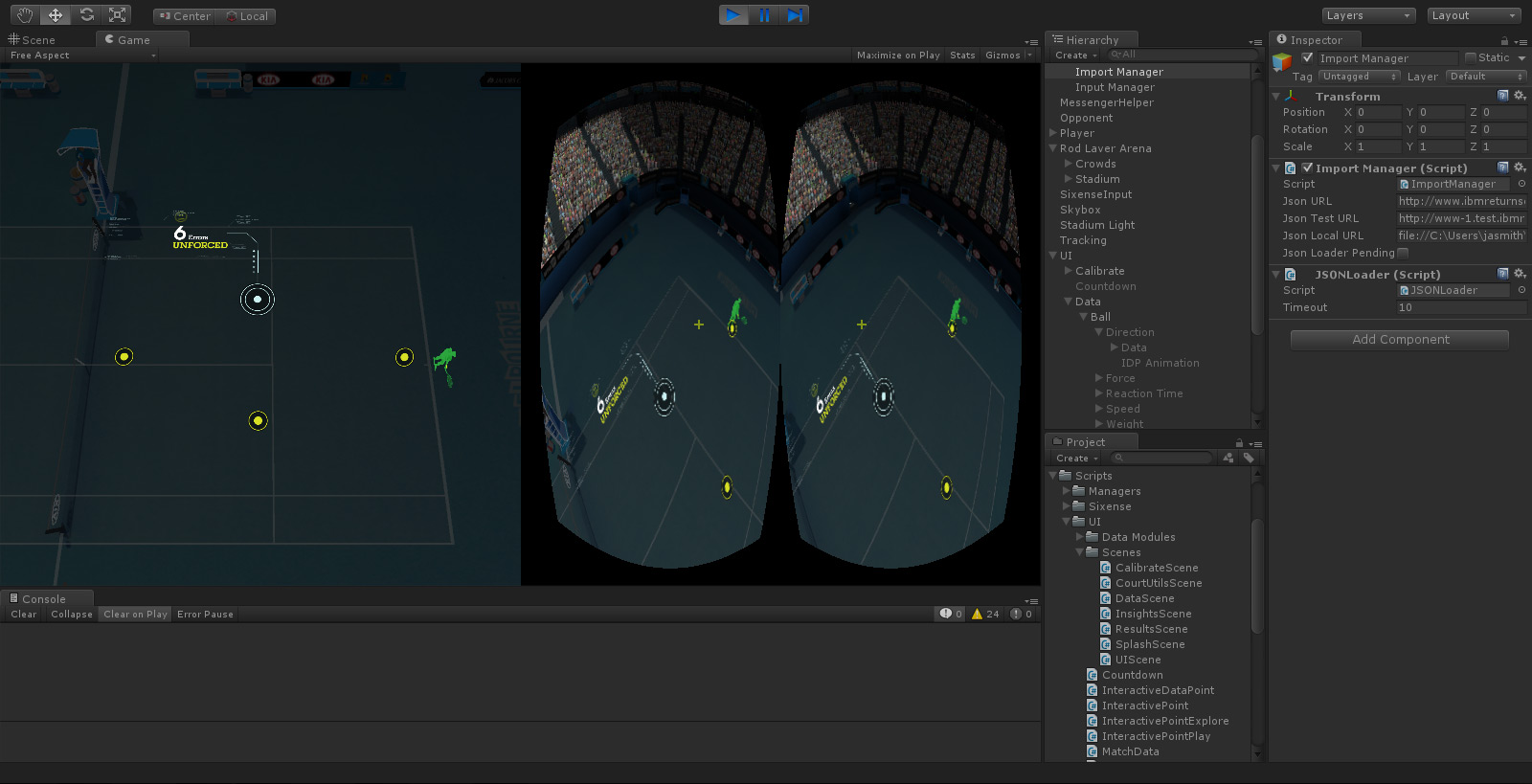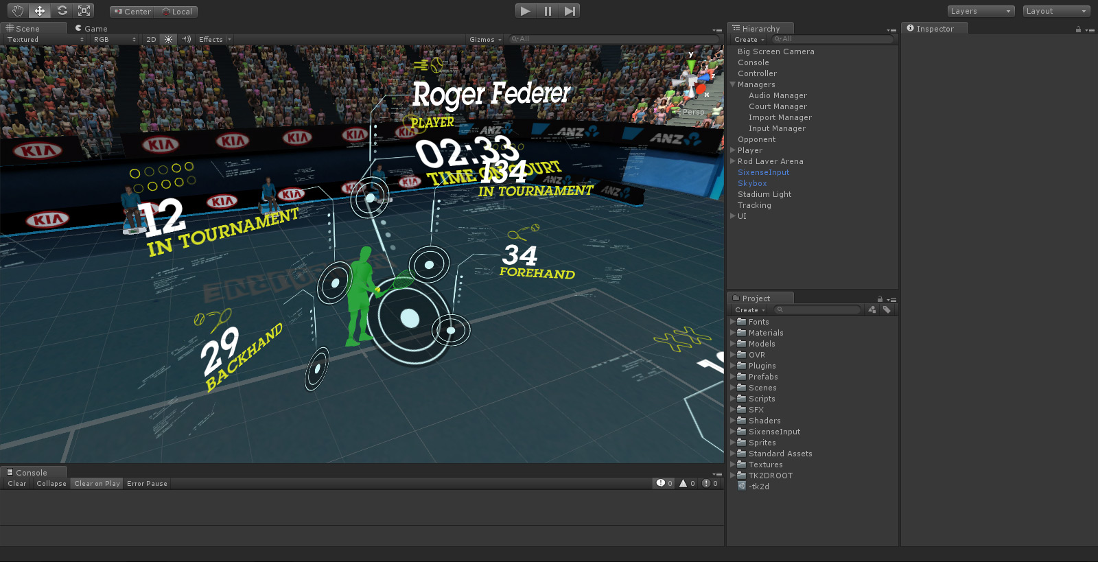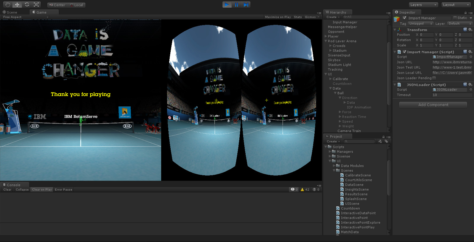 IBM's Return Serve was a virtual reality kiosk application for the 2014 Australian Open Tennis Championships. Powered by IBM's data, processed live from Tennis Australia, participants were challenged to return the last serve played on Rod Laver Arena. Live. To do so, they were required to wear the Oculus Rift headset to immerse themselves in a digital replica of Rod Laver Arena, then take ahold of a Razer Hydra motion sensor controller to swing their virtual tennis racket.